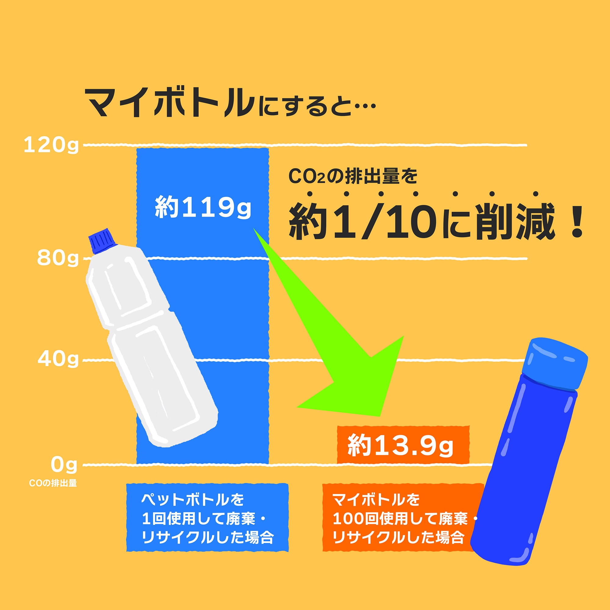 たとえば、一般的な500mLのペットボトル1本をつくって、使って、リサイクルするまでに出るCO2は約119gといわれています。でも、同じ容量のステンレス製のマイボトルを100回使えば、1回あたりのCO2排出量は約13.9g。