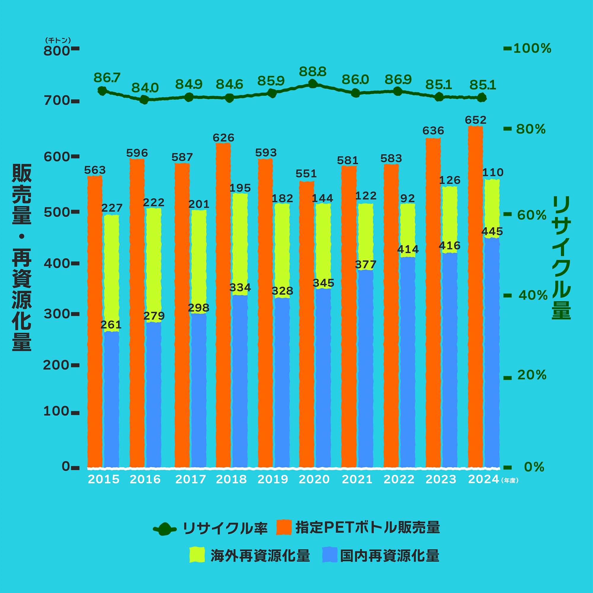 世界中で驚くほどの数が消費されているペットボトルですが、実は資源としてリサイクルしやすいというメリットがあります。日本での2024年度のリサイクル率は85%に達しており、欧州の42.7%(2021年)、米国の18%(2020年)と比べても、突出したリサイクル率の高さを誇っています。回収率においても94%(2021年)と世界トップレベルです。これだけ高いリサイクル率が実現しているのは、多くの人が普段からスーパーなどでペットボトルを分別したり、家できれいに洗ってからリサイクルに出すといった行動を続けているからです。1995年に始まった「容器包装リサイクル法」で分別が義務づけられたことに加えて、飲料メーカーやスーパー、リサイクルを支える会社などの取り組みも、この仕組みを支える大きな力になっています。