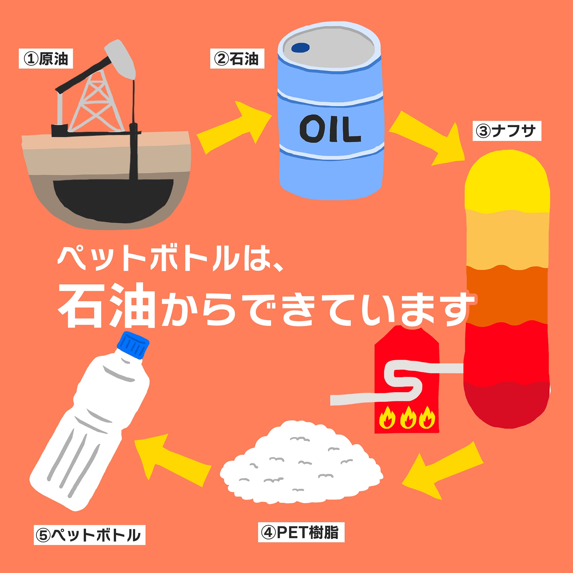 暮らしに欠かせないペットボトルは、「PET(ポリエチレンテレフタレート)」というプラスチックから作られています。原料には石油が使われ、精製されたナフサをもとにPET樹脂が製造されます。これを加熱·成型することで、飲料用などさまざまな容器へと加工されます。ペットボトルは軽くて丈夫で、持ち運びやすく、リサイクルしやすいといった利点があります。一方で、使用後に適切に回収·再資源化されなければ、資源の浪費や二酸化炭素(CO2)の排出増加につながり、環境への負担が大きくなります。