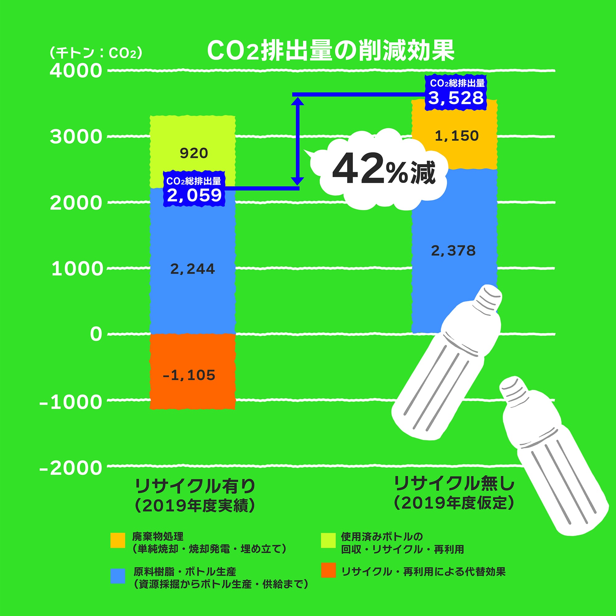 ペットボトルをリサイクルすることで、限りある石油資源の使いすぎを防ぐことができます。また、原料の採掘から製造、使用後の回収·リサイクルまでを通して見たとき、リサイクルをしない場合と比べてCO2の排出量を約42%も減らせるという試算もあります。